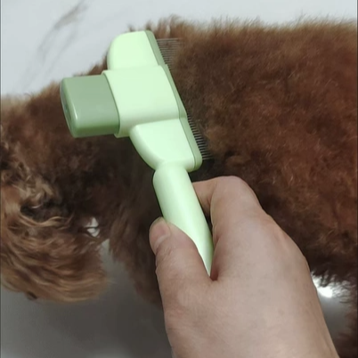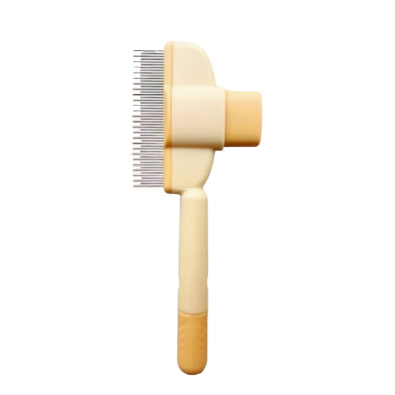 The brush features a self-cleaning mechanism—simply push the button to release collected fur, making cleanup hassle-free.