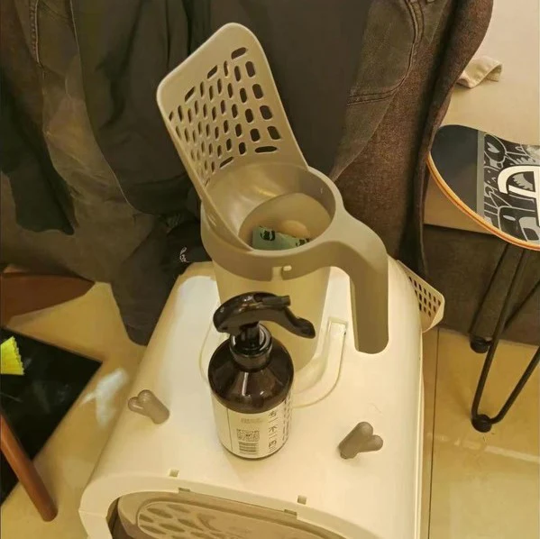 Attached waste bin and clever trap door design makes cleaning the litter box a whole lot easier.